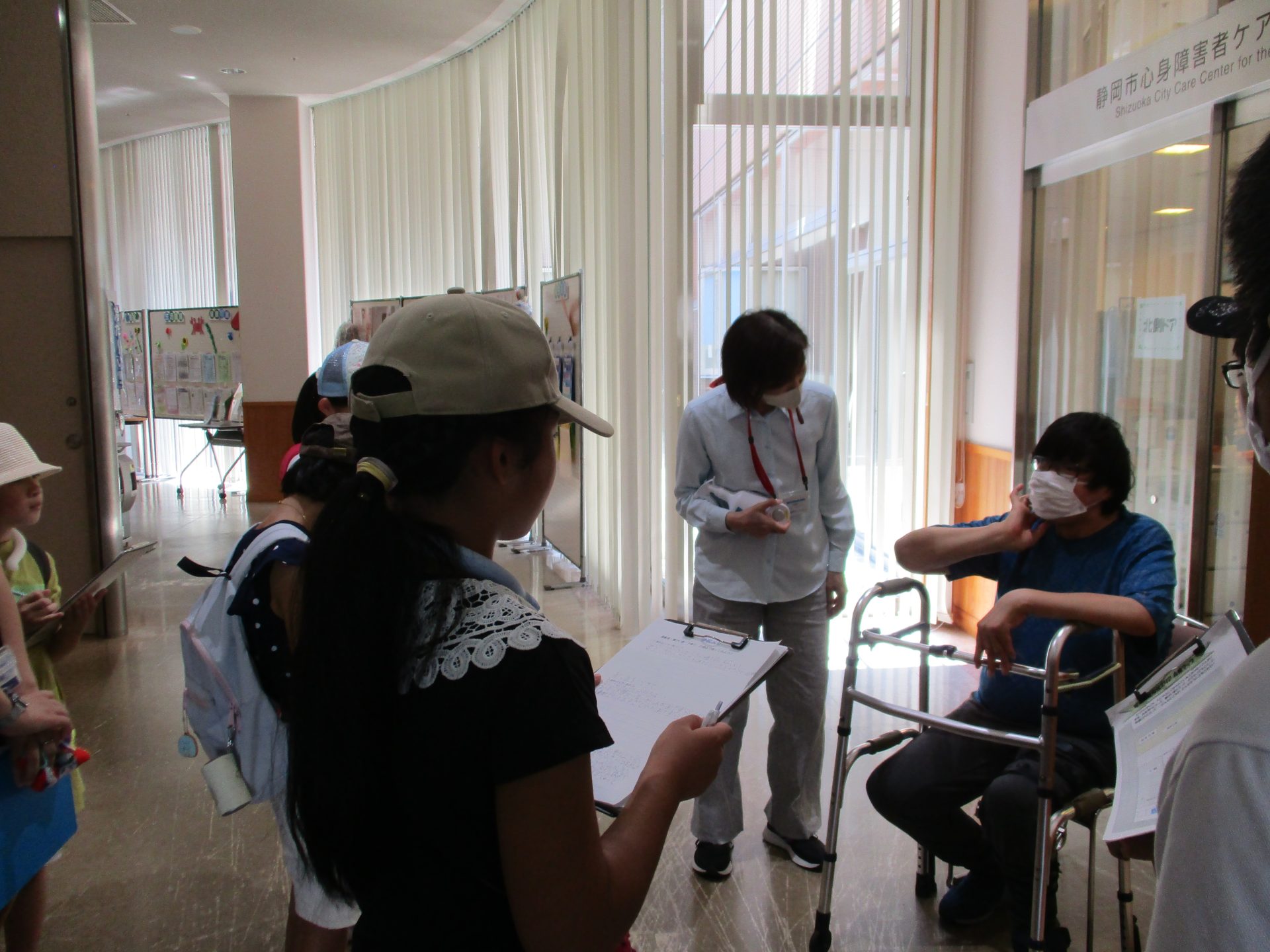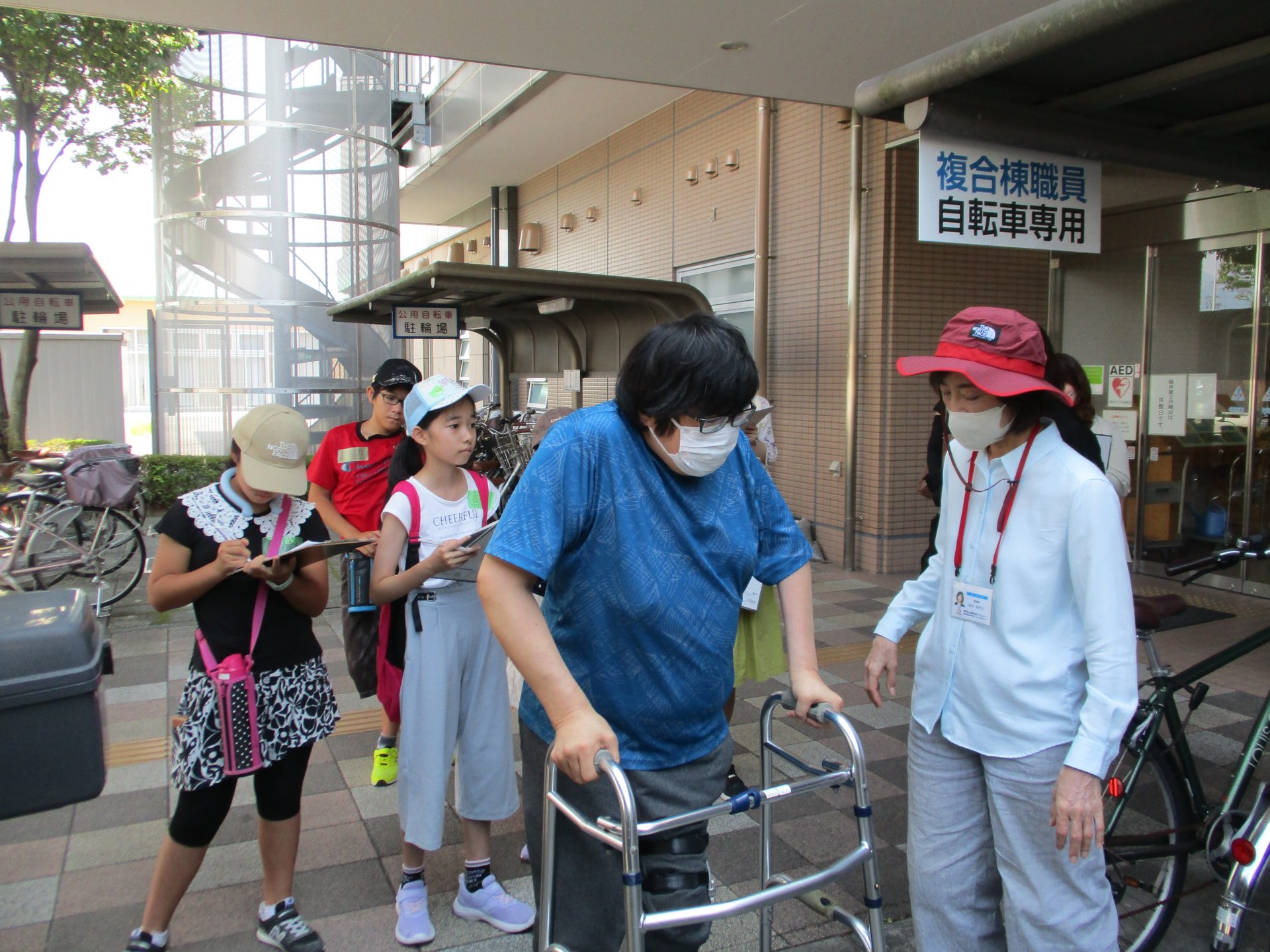 参加された小学生からは、「歩行器で歩くときに大変なことは何ですか?」と質問があり、利用者さんからは「館内のように床がつるっとしている場所は進みやすいけど、駐輪場のようにコンクリートがタイルのように区切られているところは歩行器を毎回持ち上げなければならないので大変です」とのお話がありました。
